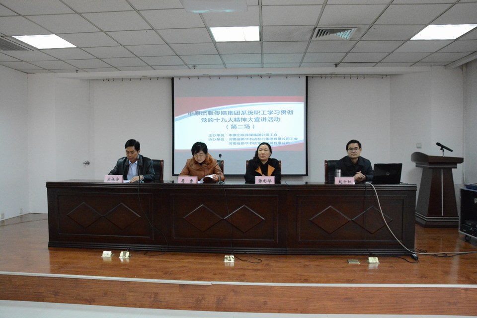 12月27日下午,按照《河南省總工會關(guān)于開展河南省職工 學(xué)習(xí)貫徹黨的十九大精神 千名勞模大工匠·萬場大宣講活動的通知》要求,由中原出版?zhèn)髅郊瘓F主辦、河南省新華書店發(fā)行集團承辦的出版集團系統(tǒng)職工第二場學(xué)習(xí)貫徹黨的十九大精神宣講會在發(fā)行集團四樓會議室舉行,中原出版?zhèn)髅郊瘓F黨委委員、副總裁、集團直屬單位黨委書記馬雪總裁,集團工會副主席、集團直屬單位黨委副書記張彩華主席出席會議,發(fā)行集團班子成員、中層人員、部分黨員和職工代表,及來自河南省新華書店文化發(fā)展公司、銷售與市場雜志社、《中學(xué)生學(xué)習(xí)報》社、出版對外貿(mào)易公司共6家單位150余名干部職工參加了此次宣講學(xué)習(xí)活動。
