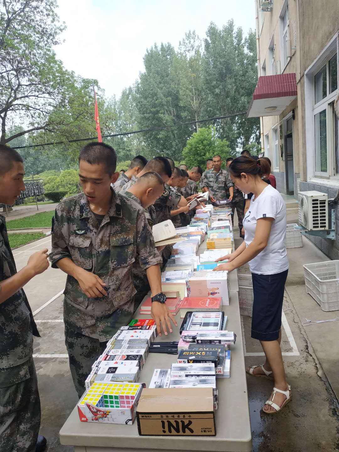 “八一”前夕,襄城縣店積極組織員工冒著高溫到駐軍部隊(duì),開展主題流動(dòng)售書活動(dòng),為戰(zhàn)士們送去豐富的精神食糧,受到熱烈歡迎。