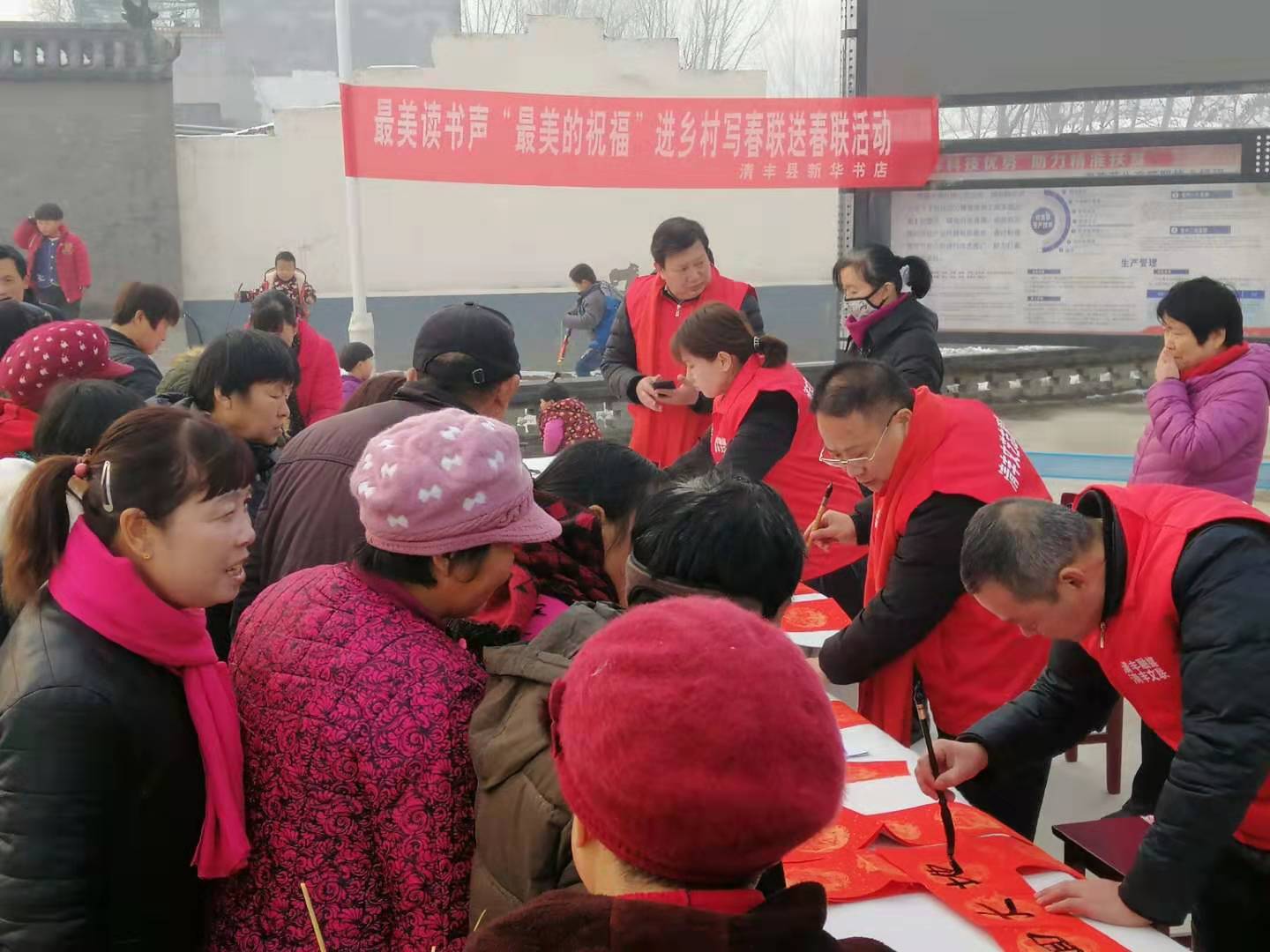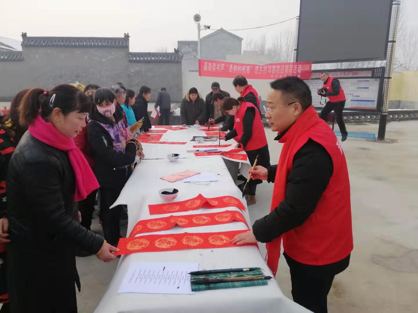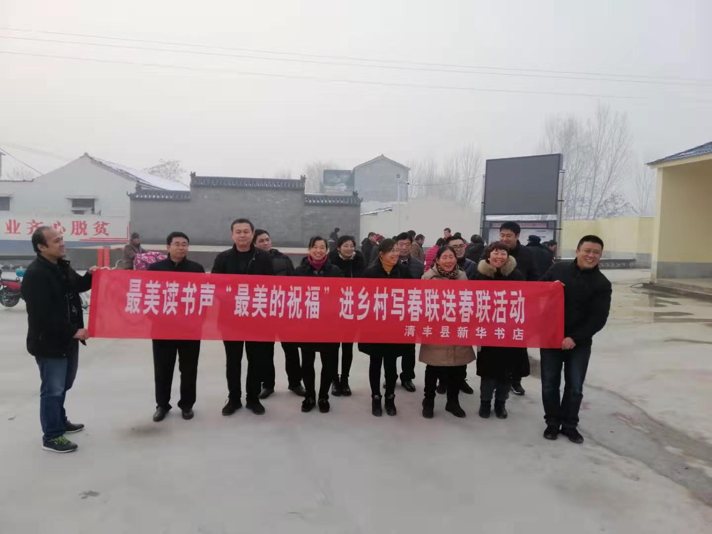 1月17日下午,清豐縣新華書店邀請(qǐng)清豐縣文聯(lián)書畫名家到大流鄉(xiāng)劉圈村開展“最美的祝!庇履陮懘郝(lián)送春聯(lián)活動(dòng)。