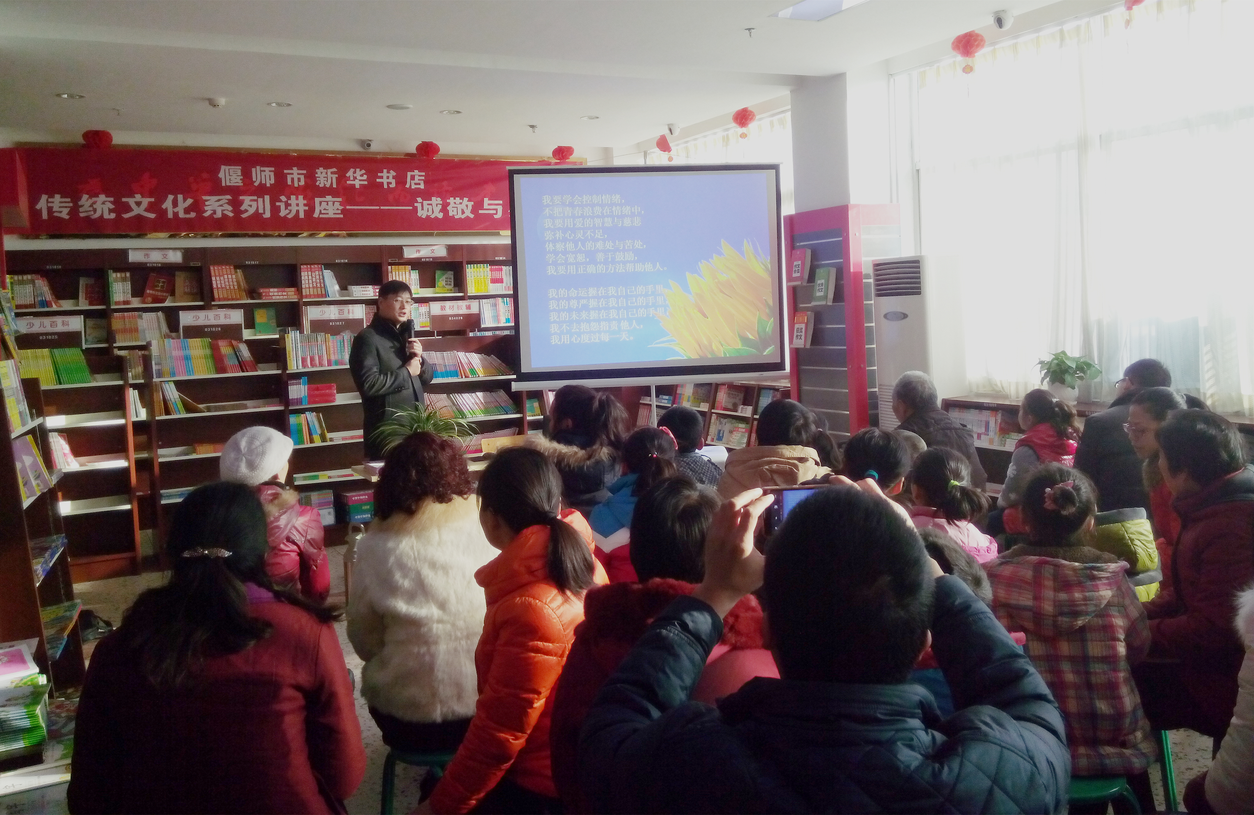 2月8日上午,偃師市店邀請知名教育專家肖俊峰老師到購書中心,為廣大學生和家長進行了一場精彩的傳統(tǒng)文化教育講座----誠敬與感恩。肖俊峰老師結(jié)合自己創(chuàng)辦睿源學校的親身經(jīng)歷,現(xiàn)身說法就如何感恩社會、如何孝敬父母等一系列問題與現(xiàn)場的家長和學生互動交流,現(xiàn)場不時爆發(fā)出陣陣掌聲。此次活動主題鮮明、內(nèi)容豐富、形式多樣,使在場的學生及其家長深受教育、獲益匪淺,紛紛表示望此類活動多多舉辦。