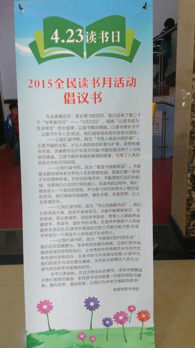為更好營造書香社會,促進(jìn)社會閱讀風(fēng)尚的形成,提升民族文化素質(zhì),推進(jìn)學(xué)習(xí)型城市建設(shè),提高我店綜合收益,在4月23日世界讀書日來臨之際,新密市新華書店發(fā)出了2015年全民讀書月活動倡議書,提出了“美麗四月天,相約讀書日”閱讀主題,全力搞好宣傳,確;顒尤〉脤(shí)效,該店利用電子顯示屏、張貼海報(bào)、賣場布置等手段進(jìn)行宣傳,營造氛圍,并積極組織開展流動售書活。