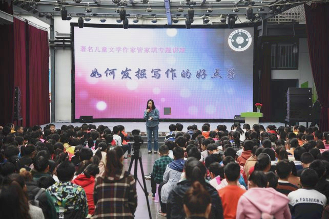 在“名家進校園”活動中,管家琪老師每到一所學校,都以自己如何與寫作結(jié)緣為引,談到自己獲得寫作題材的方法,鼓勵學生們在日常中多記錄,做好筆記,尋找發(fā)現(xiàn)的眼睛,結(jié)合寫作經(jīng)歷和生活小故事,以通俗易懂、風趣幽默的語言和豐富的人生經(jīng)歷,和學生共同分享閱讀和寫作中的感悟,教學生發(fā)揮想象,感受寫作帶來的樂趣。精彩互動環(huán)節(jié)中,管家琪老師以游戲的方式和孩子們玩起來寫作游戲。針對大家寫作方面的迷茫與困惑、管家琪老師與現(xiàn)場孩子們進行真摯而親切的交流,解答孩子們的困惑;顒蝇F(xiàn)場氣氛活躍,活動的最后管家琪老師還建議孩子們,在日常生活中,多閱讀名著以及積極向上的作品,它可以開闊視野,拓展思維。現(xiàn)場觀眾或積極提問、踴躍發(fā)言,或認真聆聽、認真記錄,現(xiàn)場洋溢著開心閱讀氣氛。在每次講座結(jié)束后,管家琪老師還饒有興趣地為喜歡自己作品的小讀者簽名留念。